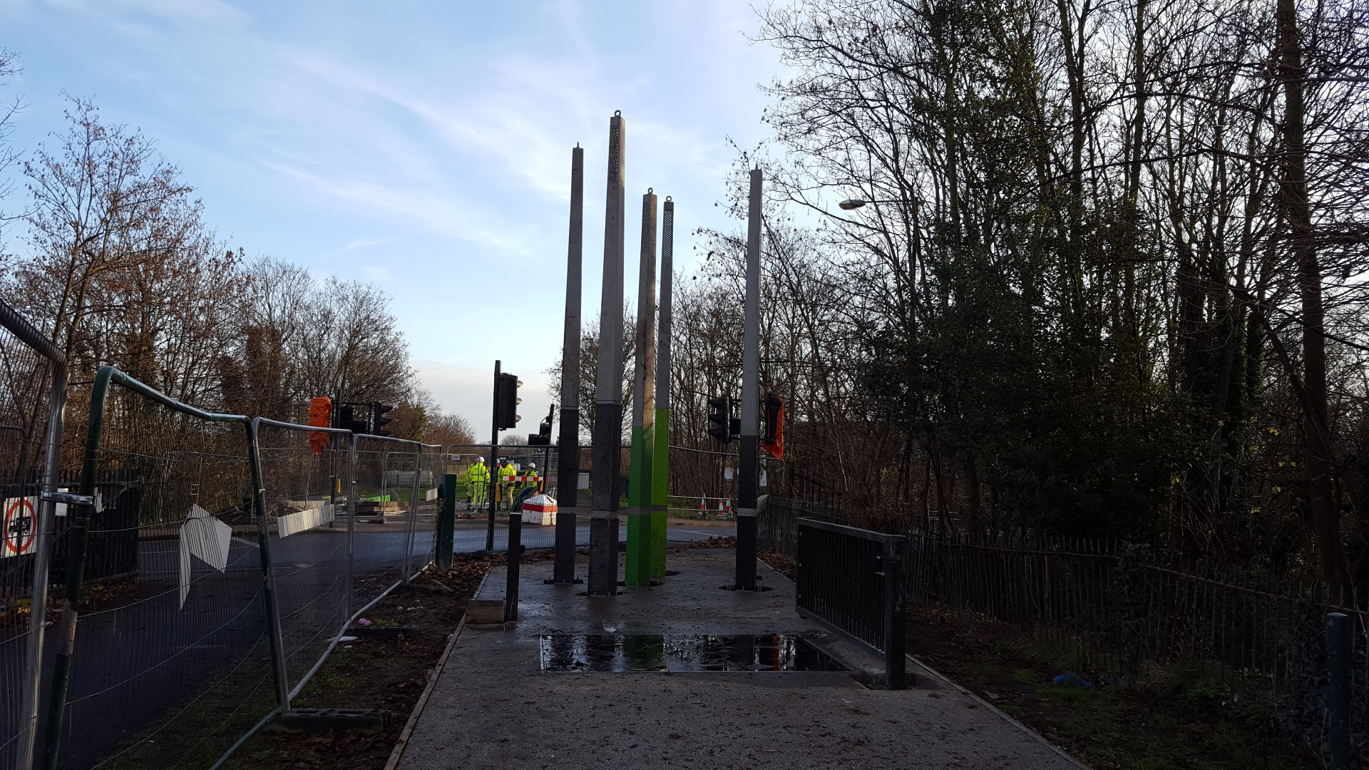 These columns were a little tricky to get right, large studding had been installed into the concrete base by the groundsman and with the use of a crane, it was our job to lift the posts up and install them level. Some of the holes didn’t align with the studding and they had to be widened using a magnetic drill