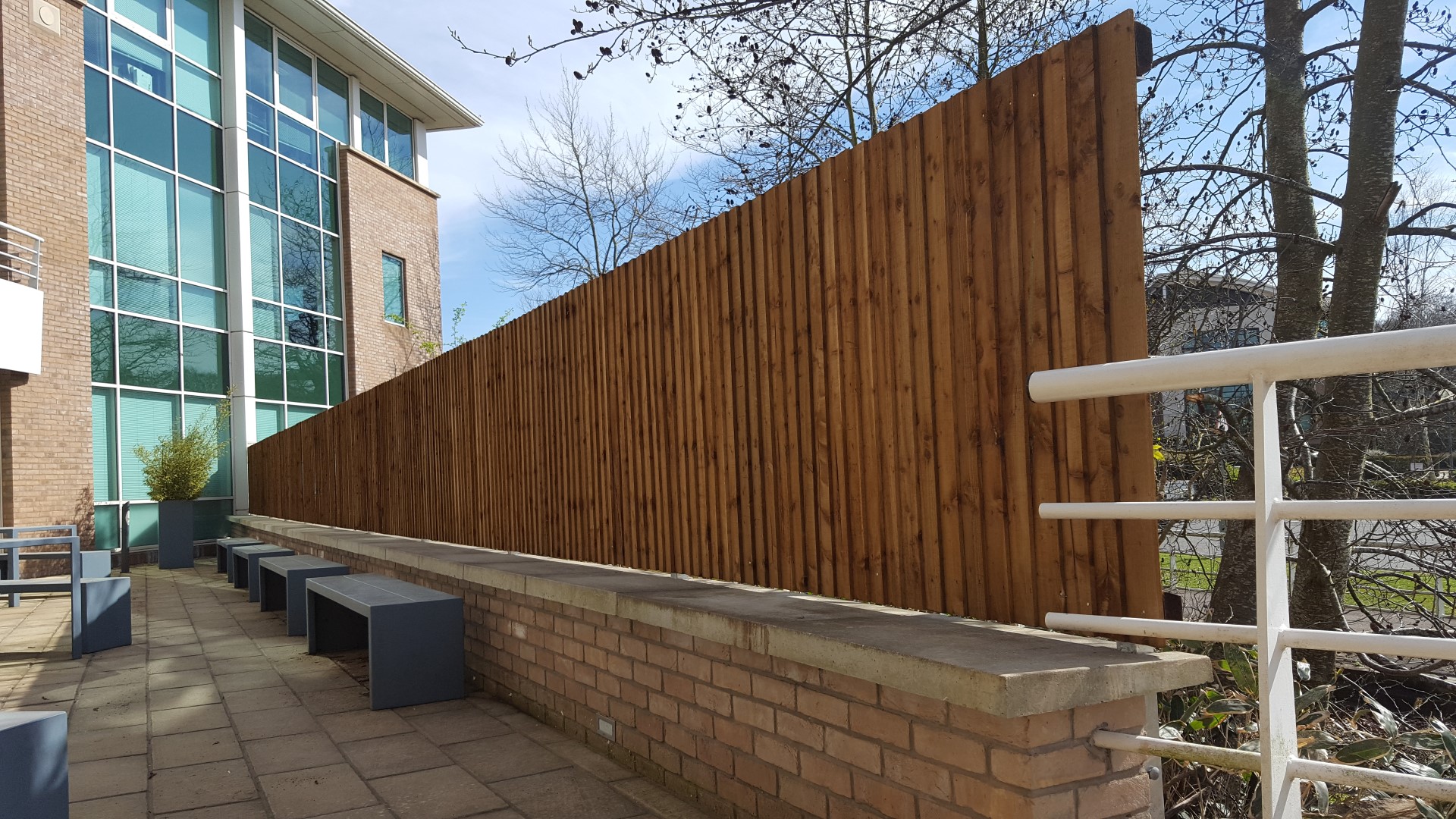 The top coping stone had to be cut where each post was ensuring that it was not broken. Metal posts were installed to the wall using resin anchors and a gap under the fence to prevent rotting of the boards.